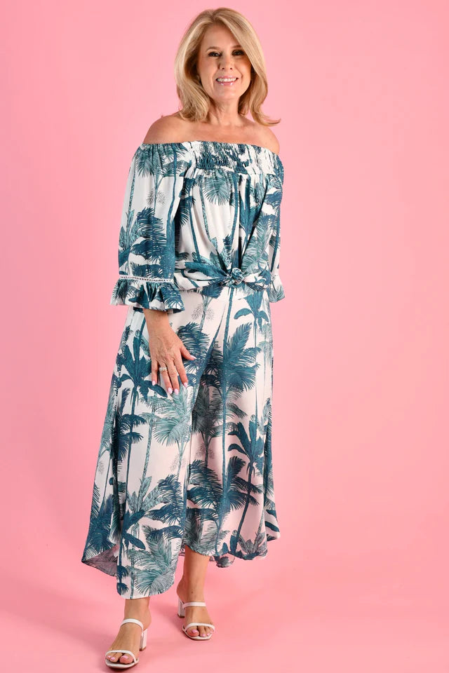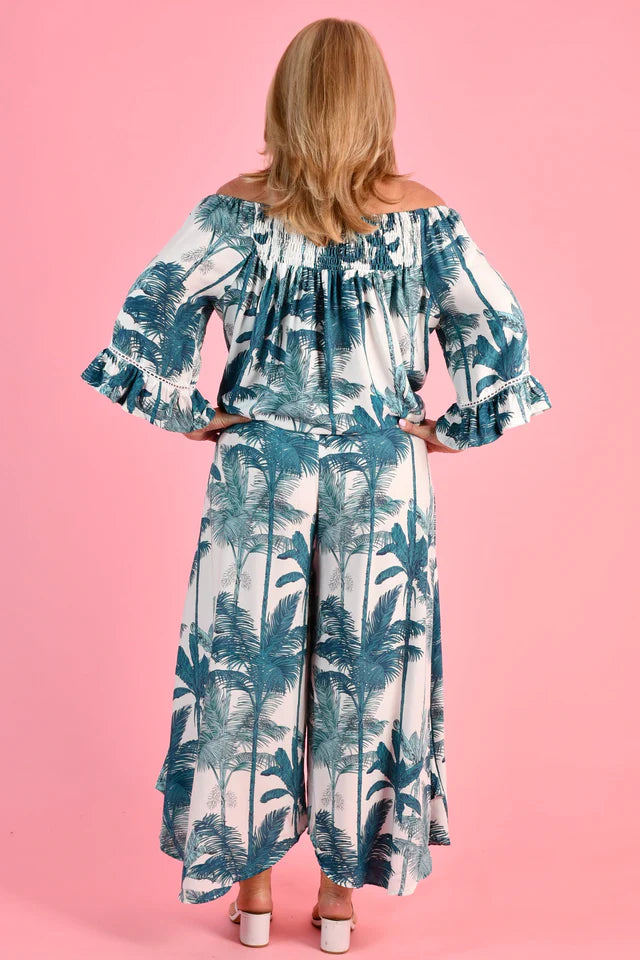 Step out in style with our Sydney Pants in Fern! These playful 7/8 length pants feature a stunning black and cream palm design, a banded front for a flattering fit, and an elastic back for comfort. Plus, with practical pockets, you can carry all your essentials without compromising your fashion sense. Go ahead, make a statement with these wide leg pants!